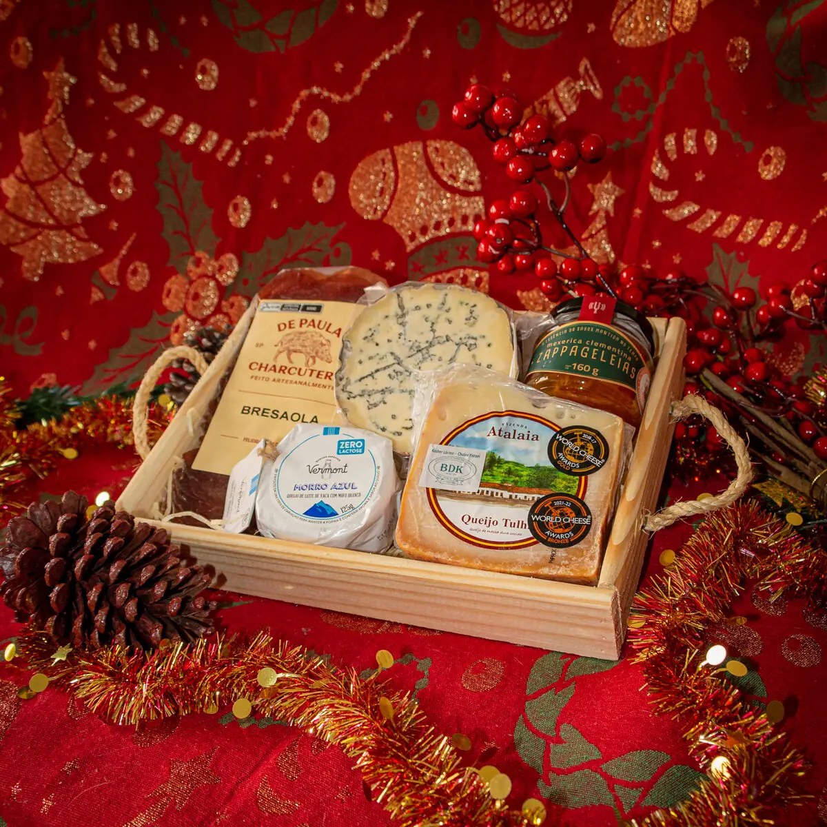 Todos os itens são acomodados em uma bandeja de madeira especial para presente, garantindo sofisticação e praticidade em um só pacote, podendo se transformar na própria tábua de frios para servir à mesa.