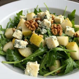 - Em uma tigela grande, misture a rúcula, peras, nozes e gorgonzola de colher.